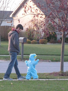 we didn't make ben trick or treat. he just wanted to hang out and say hi and bye bye to everyone. at one point, he decided to go with a group of trick or treaters who came to the house. he took off down the sidewalk and driveway with them. was hilarious. he then proceeded to walk back and forth between our house and the neighbor's house.