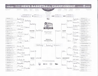 but this year is different. nick and i both filled out brackets. crazily enough, we both have kentucky winning. no, we didn't fill them out together. no we did not discuss who we were picking. and i told nick that he wasn't allowed to research prior to making his picks. he swears he didn't cheat. that he filled it out randomly. i think he has filled out a second one that he actually did some home work on. not 100% sure. i haven't seen it. i know he filled some out online as well. i believe that he used my picks in one too.